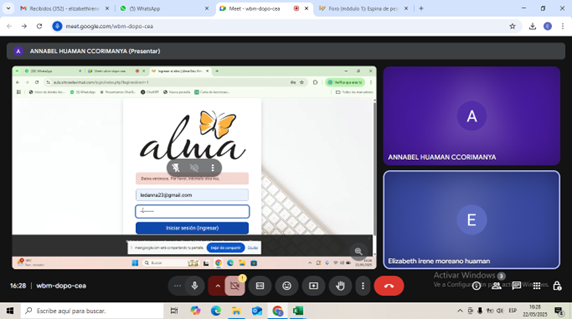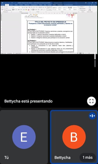Par el desarrollo de dichas actividades siempre contamos con el apoyo de nuestra maestra acompañante por parte de Alma quien absuelve las consultas y dudas todos los martes y jueves a través de la sala meet en el horario de 3:00 a 5:00 de la tarde para dar algunas orientaciones a los docentes participantes y así ellos se motiven a poner en práctica la propuesta educativa de ALMA.